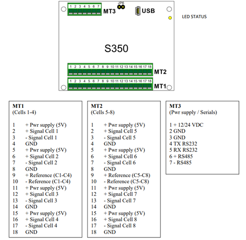 Principais funções: diagnóstico de falhas local e remoto, função de emulação da célula defeituosa com exclusão do sistema de pesagem e recalibração automática da nova célula de carga. Possui duas entradas seriais: COM1: RS232 para configuração de parâmetros a partir do PC e COM2: RS485 com protocolo Modbus RTU ou Fieldbus (Profinet, Profibus, Ethernet IP).
