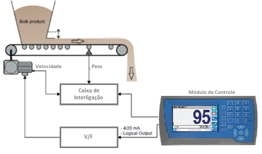 As células de carga medem o peso do material na correia (kg) e um sensor de alta precisão adquire a velocidade da correia (m/s), onde o produto destas duas variáveis é a vazão instantânea (kg/h). A diferença da referência de trabalho (setpoint) com relação a vazão instantânea (kg/h) será o fator de ajuste necessário para a correção da velocidade da correia.