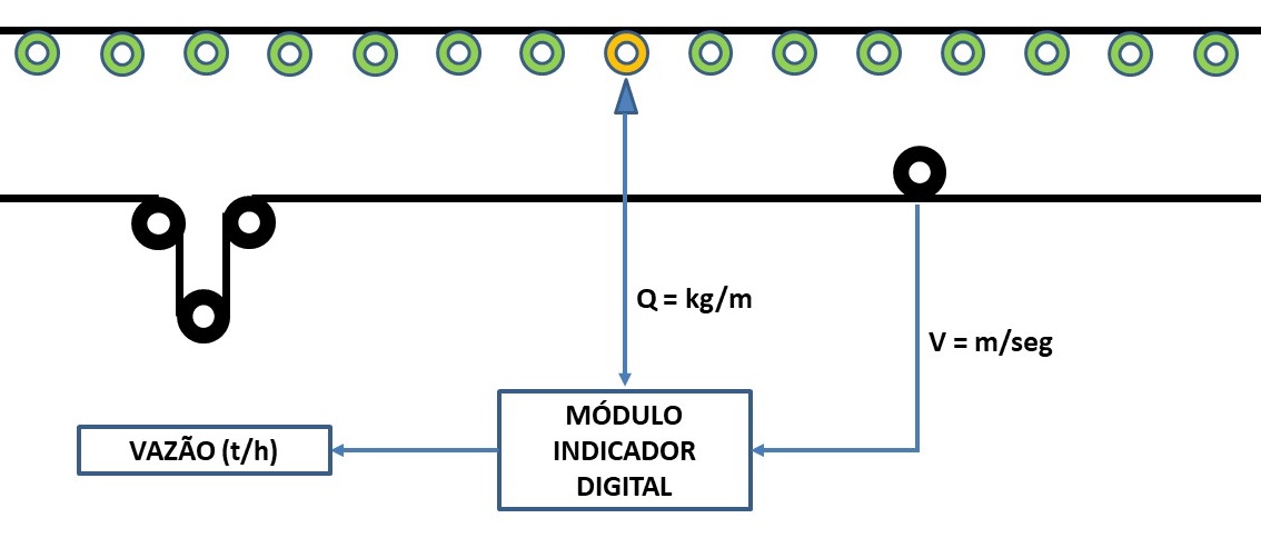 As células de carga medem o peso do material na correia (kg) e um sensor de alta precisão adquire a velocidade da correia (m/s), onde o produto destas duas variáveis é a vazão instantânea (kg/h). A balança irá informar a vazão instantânea e o valor totalizado durante o período de trabalho.