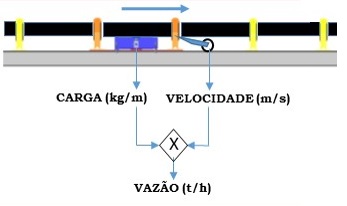 As células de carga medem o peso do material na correia (kg) e um sensor de alta precisão adquire a velocidade da correia (m/s), onde o produto destas duas variáveis é a vazão instantânea (kg/h). A balança irá informar a vazão instantânea e o valor totalizado durante o período de trabalho.